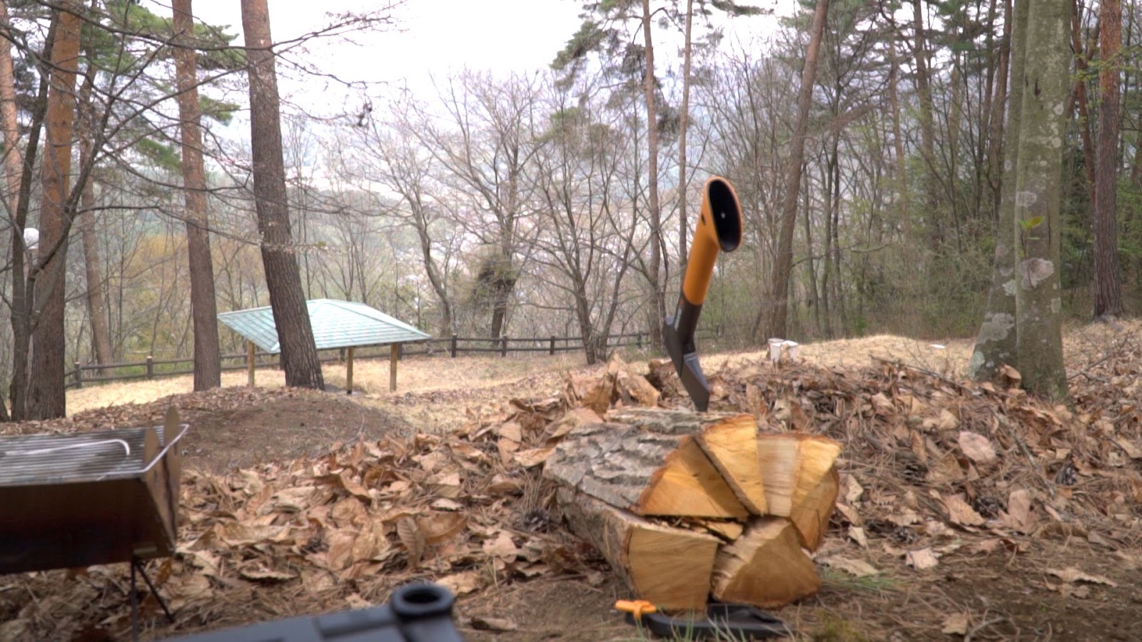 でも持っていったフィスカースの手斧では鋭い刃が堅い薪に食い込んでバンバン割ってくれました。