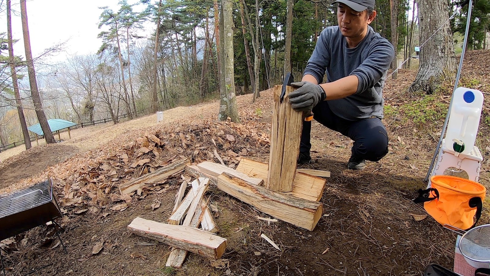 今回薪が非常に堅くてナイフでのバトニングでは太刀打ちできませんでした。多分クヌギとか樫とか?広葉樹系の堅くて重い薪です。