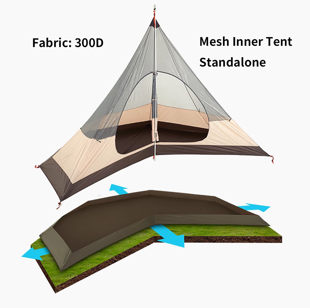 インナーの底の素材には耐水圧3000㎜のナイロンが使われていますので、雨水には非常に強いことが分かります。私は主にソロでインナー無しで使用していますが2〜3人はコットを使用して寝られ、内部で過ごせる大きさです。大きさ的にはテンマクデザインのサーカスTCと同じくらいだと思います。
